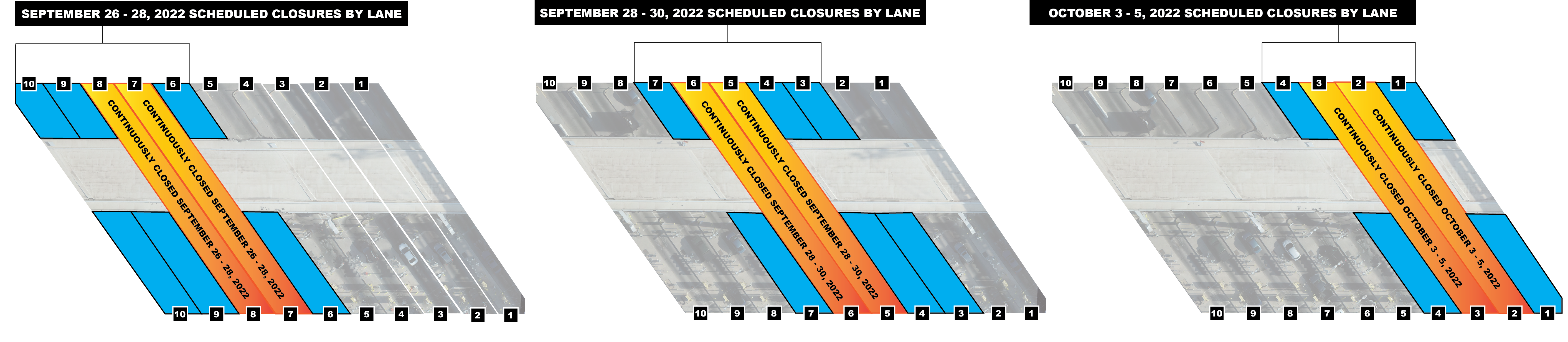 - September 28, 2022 to September 30, 2022 - The five middle northbound vehicle lanes (3-7) will be closed during non-peak, nighttime hours, from 8 p.m. to 6 a.m. Lanes 5 and 6 will remain closed continuously, including during daytime hours.