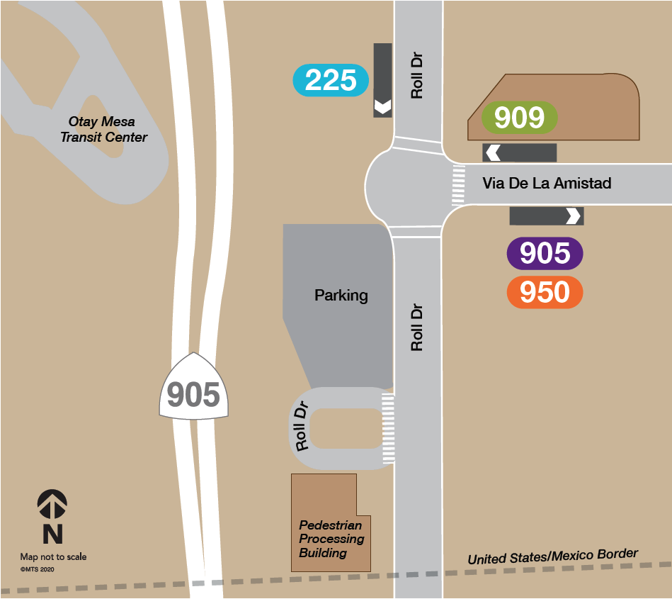 To accommodate pedestrian travelers, MTS will shift their bus operations to the intersection of Roll Drive and Via de la Amistad for bus routes 905, 909, 950, and Rapid 225. For pedestrians crossing through the Otay Mesa LPOE, this intersection can be reached by continuing northbound on Roll Drive immediately upon exiting the pedestrian inspection building.