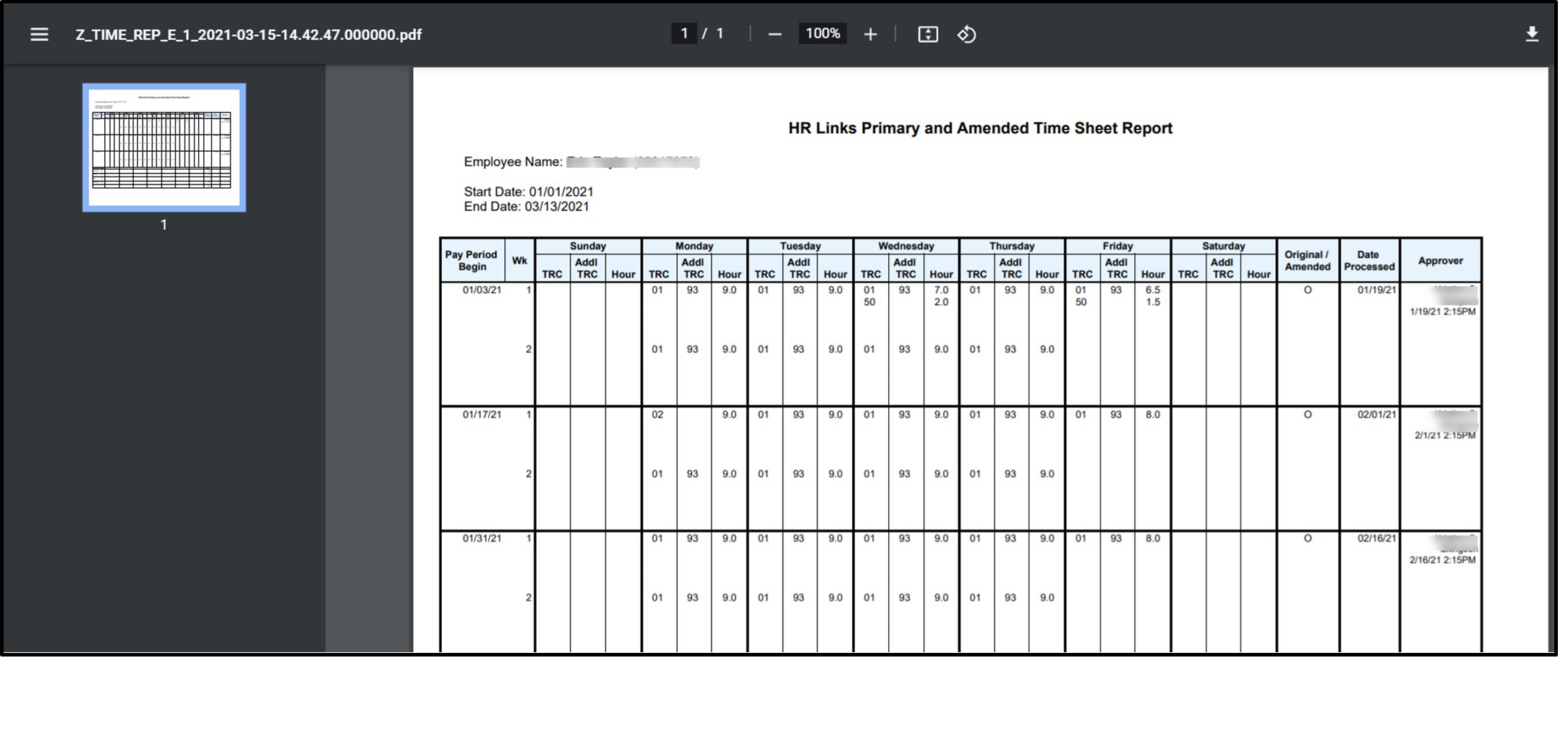 The timesheet report shows the hours and time reporting codes on your timesheet over a range of dates. The timesheet report shows both the original timesheet and any amendments made to the timesheet.